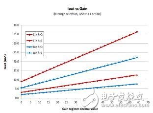 通过连在R-EXT引脚和GND引脚之间的外部电阻,可以设置驱动器的输出电流。同时,还可通过配置寄存器专用位来修改电流值。根据内部增益和范围调整,该产品可将电流升到36mA或降到3mA。所以无需修改外部电阻值即可更改输出电流,从而避免修改硬件,如图2所示。这个功能还能用于全局模拟调光功能,设置驱动器输出直流可调节LED的亮度和色温。
