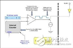 通过控制12/16位PWM灰度亮度,可调节每个通道的亮度。亮度数据通过SDI引脚装入16位移位寄存器,每个输出通道都有一个移位寄存器。输出PWM信号是比较亮度寄存器内容和16位或12‑位计数器(配置寄存器选择)而产生的。计数器时钟源由PWCLK引脚提供,如图5所示。