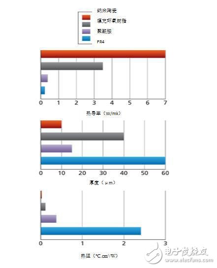 例如,中高功率LED阵列通常建立在导热PCB上。在顶面,有铜板与LED进行电连接,而在下面有一块铝来传导热量。在铜和铝之间有一电介质层,以防止铜板对铝的电短路。各制造商在选择介电材料方面采取了不同的方法,从有机材料到无机化合物,涵盖了整个光谱。如图2所示,热电阻最小的电介质材料几乎是一个数量级的,可以应用最薄的电介质材料,同时仍能提供所需的绝缘隔离。