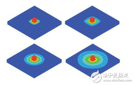 瞬态冷却的空间分量源于热量往哪个方向扩散多一些。比如,一个安装在大的薄金属板上的LED。最初,整个板处于环境温度。LED作为点热源。在接通时,LED会产生热量,通过传导将热量传递到板中。热量快速通过金属板,提高了LED下方区域的温度。因此,最先的时候,金属板的一小部分是来冷却LED的。金属板的导电性意味着LED的一些热量会在板内横向扩展,最终出现在表面上(图5所示)。因此,参与冷却LED的金属板的体积会随时间而增加,导致热阻和热容量出现明显改变。