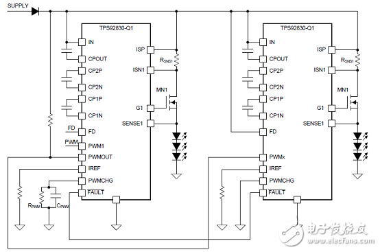 图3.TPS92830-Q1 PWM发生器主从配置图