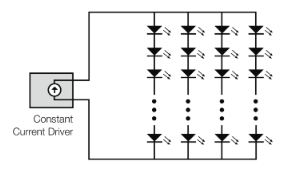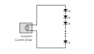 在串联配置中,各个LED串联布置。这样做的优点是,相同的电流经过它们中的每一个,导致发出的光亮度相同。另一个优点是,如果一个LED在短路中出现故障,其他LED不受影响,仍然亮着。缺点是如果一个LED在开路中出现故障,则电流将被中断,其他所有LED都熄灭。另一个缺点是,如果需要许多LED来产生所需的光量,则正向电压的总和可能需要使用相当高的输出电压的电源。
