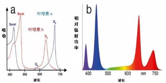 图1a和b:(a)叶绿素a和叶绿素b吸收光谱;(b)以及园艺专用COB LED模块的发射光谱 。