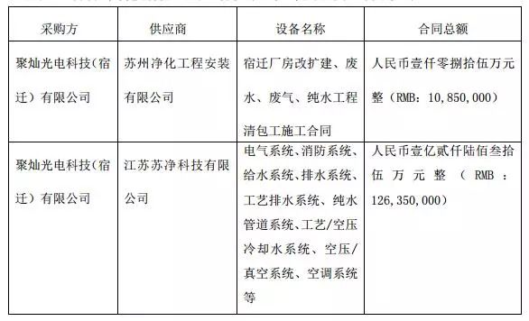 同日晚间,聚灿光电还发布公告称,公司全资子公司聚灿光电科技(宿迁)有限公司(以下简称“聚灿宿迁”)拟与苏州净化工程安装有限公司、江苏苏净科技有限公司签署以下重大采购合同,明细如下: