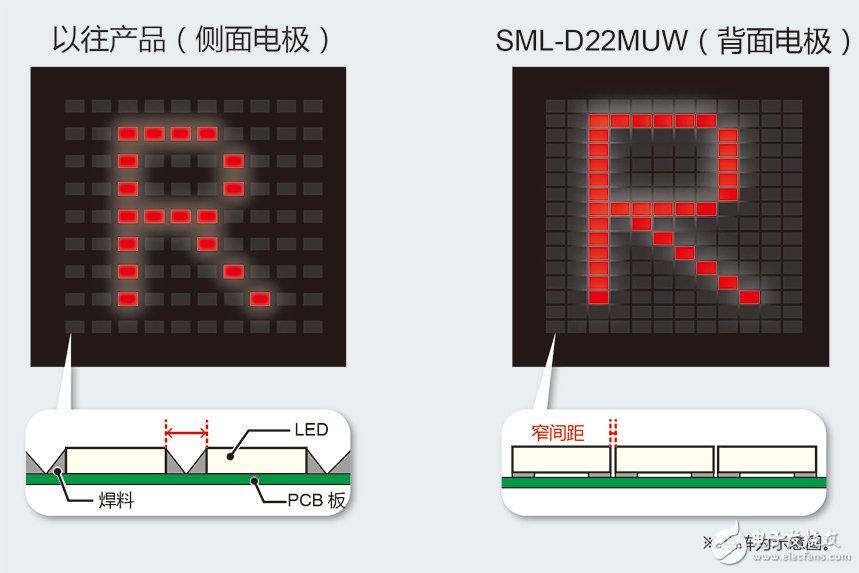 封装采用背面电极,可很窄间隔安装。这在点阵等中可实现非常高清晰的显示 。