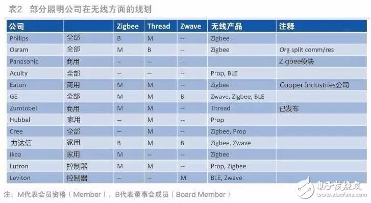 表2说明了这些领先联网照明厂商在zigbee/Thread联盟中扮演的角色,会员(M)在联盟中是一般身份,而董事会成员(B)则可以指导联盟的发展方向。在联盟中,大家都关注zigbee、Thread和Zwave的发展方向,后者是美国的一种Sub-GHz协议,即低于1GHz的私有协议(注:关注Zwave主要不是因为照明,而是用于家庭安防)。