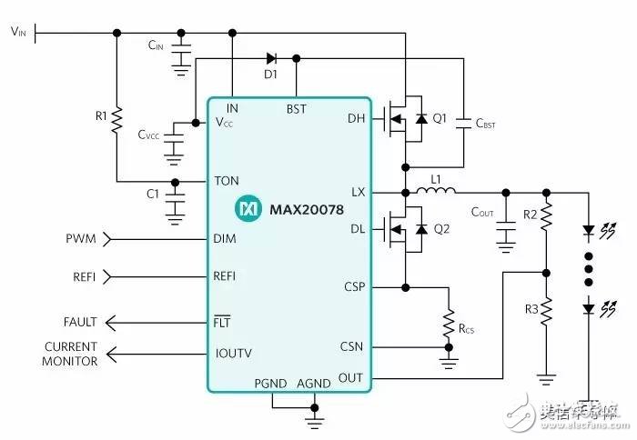 Maxim的最新汽车级控制器——MAX20078同步buck、高亮度LED控制器则解决了这些设计挑战,有效地提高了汽车照明系统的性能。