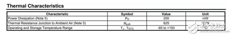 从中可知,其耗散功率PD=200mW,热阻为625℃/W,其中这两个量是环境温度25℃,焊在FR-4材质 PCB条件下测试的,如手册说明Part mounted on FR-4 PC board with recommended layout 。