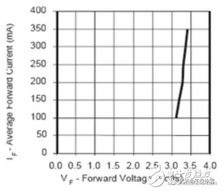 假如用干电池或蓄电池供电,那么因为LED伏安特性的非线性,很小的电压变化就会引起很大的电流变化,上图中电源电压在3.3V时正向电流为20mA的LED,如果用3节干电池供电,新的电池电压超过1.5V,3节就是4.5V,LED的电流就会超过100mA,很快就会烧坏。对于1W的大功率LED也是如此,图2是某公司1W的LED伏安特性,而一个12V蓄电池的电压,在充满电到快放完电的电压可以从14.5V降到10.5V。相差将近20%。从伏安特性上可以看出,电源电压的10%的变化(3.4V-3.1V),就会引起正向电流的3.5倍的变化(从350mA变到100mA)。