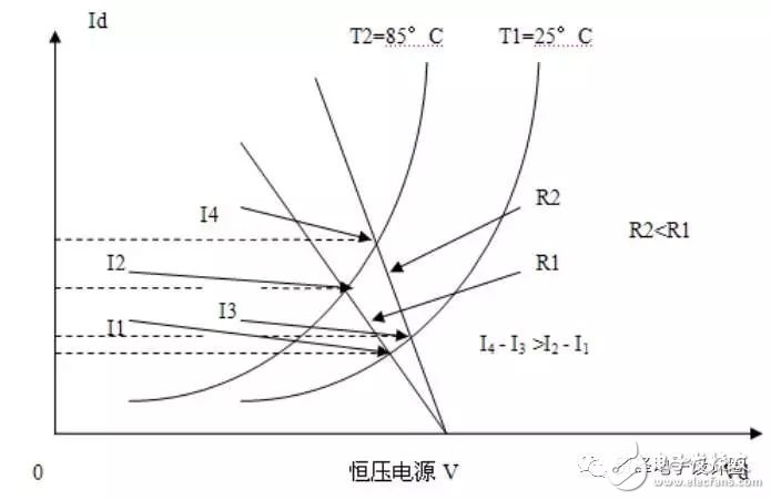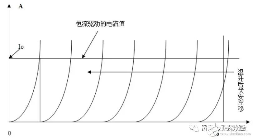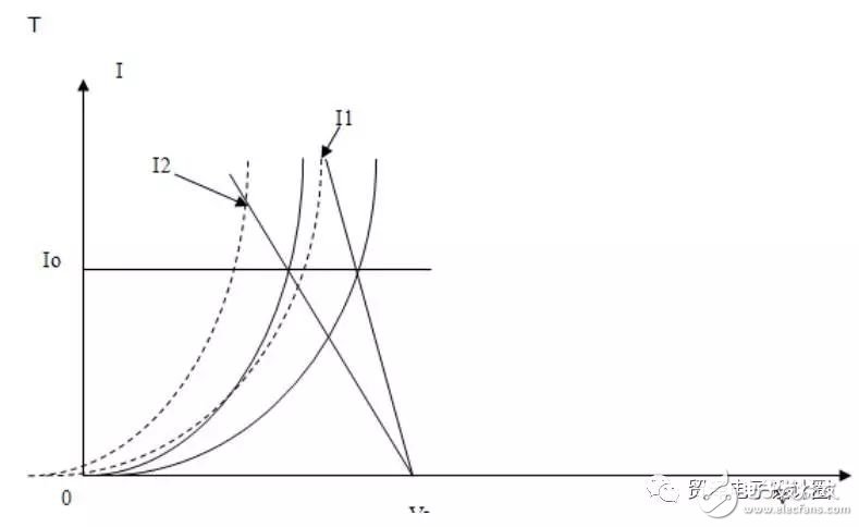 温升以后,N个伏安特性都左移,就使电流的增加也加大了N倍。如果采用恒流电源供电,那么温升以后,仍然能够保持电流恒定为Io。