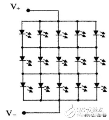 假如只是两串并联,而且其中某一串的一个LED坏了(开路),这时候不但这一串不亮,而且所有的电流都会流到另一串,使得另一串的电流加大一倍,用不了多久也会坏掉。为了避免一个坏了一串不亮,那么可以采用全部并串联的方法,也就是每串中的任何一个都和其他串中的同样位置的LED并联。这样,任何一个坏了(开路),只是这一个不亮,其余的LED仍然都亮。但是假如并联的LED只有两串,其中有一个LED开路了,电流就都流到和它并联的另一个LED中去,它的电流也加大一倍,使得这一个LED寿命不长,很快烧掉;假如烧坏是开路,那么就会导致所有LED全部不亮,但其它的LED损害并不严重,因为没有长期工作于过流状态。为了减小某一个LED损坏以后对其它LED的影响,希望并联的LED串数越多越好。图7中画出了3串5并而且同行相并的图。这时候,某一个LED坏了,总电流分散到其余的4个LED中,总电流在每一行所有并联的LED中分配,正向电压偏低的LED分到的电流就会大一些。但不致造成太大的危害。