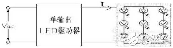将LED光源作为单组负载由单输出电源进行驱动是最简单的LED驱动控制方式。构成LED 光源的多颗LED 有多种连接方式。下图1所示的是所有的LED负载串联的连接方式,单输出电源为恒流源特性驱动LED 灯。由于光源串联,因此不存在均流问题,但当LED串联数量较大时,光源电压将增高,过高的光源电压要求灯具整体符合安全标准的绝缘成本增高,灯具散热器和绝缘要求越高,热阻也越大,散热效果变差对LED 灯寿命会产生影响。
