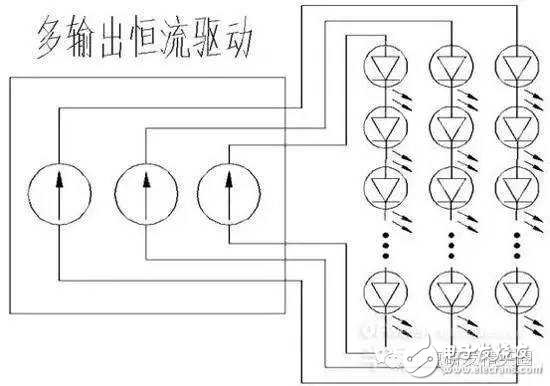 以上分析可见,单输出恒流驱动,应用中有一定的局限性,尤其是LED 光源并联的联接方式对光源的使用寿命和可靠性将产生较大影响。