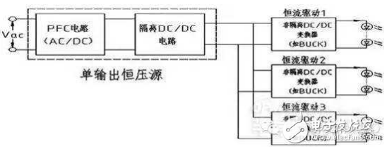 目前较普遍采用的LED 多路驱动方案如下图5所示,在单输出恒压源的输出端口,配置若干级非隔离DC/ DC 变换器,每路LED负载由单独的DC/DC变换器实现恒流驱动控制。该方案存在的缺点是,DC/ DC 变换器电路较为复杂,成本相对偏高,可靠性偏低;每增加一级DC/ DC 变换器,驱动效率相应降低,且易伴生电磁干扰(EMI);不同类型光源的每路LED 负载的电压、电流及功率存在差异,通用DC/ DC 变换器的设计很难标准化,给产业化带来很大不便。