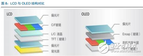 从发光原理来看,TFT-LCD是通过薄膜晶体管(TFT)上信号与电压的改变来控制液晶分子的转动方向,从而达到控制每个像素点偏振光出射与否而实现显示目的。由于液晶材料本身并不发光,因此TFT-LCD是一种被动发光型显示,需要背光源的支持。相比之下,OLED其内部发光部件为有机发光二极管,通过控制红绿蓝OLED子像素的亮度即可发出不同颜色的光,因此AMOLED面板中无需外加背光源。