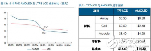 AMOLED面板成本显著降低,量产优势突现。据IHS数据显示,2015年一季度,单片5寸AMOLED面板成本为19美元,高出同期LCD成本的15.9%,但至2016年一季度,AMOLED 面板成本已降至14.3美元,低于LCD面板的14.7美元。目前, AMOLED 面板已经具备在低尺寸领域的量产成本优势。
