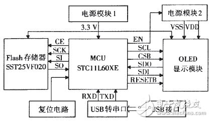 实现静态图片显示需预存图像数据。而单片机内部程序空间有限(60 k),不适合存储图像数据,采用Flash存储器作为图像数据存储区能有效地解决这一问题。单片机只需读取Flash存储器中的图像数据,再传送到显示模块即可实现静态图片显示。系统硬件结构框图如图2所示,整个系统采用5 V直流供电,两个电源模块提供整个控制电路所需电压和OLED显示所需电压,微控制器(MCU)模块实现与OLED模块和Flash存储器的通信,并提供了在线编程接口和硬件复位接口,使用SPI协议18I进行串行通信。