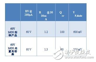 当只有优化Qrr 和VF,diode才能提高系统总体能效时,集成肖特基二极管的新ST 60V MOSFET管是一个正确选择。图3列出了标准MOSFET管和集成肖特基的功率开关管的主要电参数(两款产品的BVDSS 和芯片尺寸相同)。