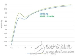 在两个拓扑内,60 V内置肖特基二极管的器件在整个电流范围内能效表现更好,从而提高了系统总体性能。