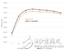 现在,我们看一下隔离功率转换器环境,当输出功率和死时数值都很大时,理想的二次侧同步整流器不仅具有尽可能小的 RDSon导通电阻,以降低导通损耗,同时还应优化体二极管特性(Qrr 和 VF,diode),以降低二极管损耗(图(1)和(2)),以最大限度降低关断尖峰电压。本文在一个500W数字电源内对60V标准功率开关管和内置肖特基的功率开关管进行了比较。数字电源由两个功率级组成:功率因数校正器和内置同步整流管的LLC谐振电路。最大输出电流是42 A,满负载开关频率是80 kHz,死时1µs。图6是能效曲线比较。