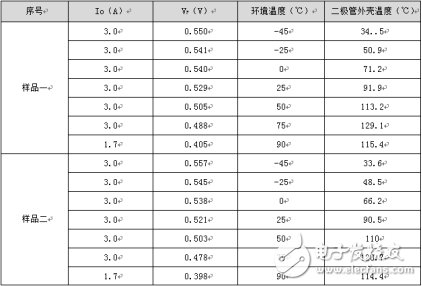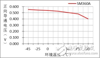 在我们开发产品的过程中,高低温环境对电子元器件的影响才是产品稳定工作的最大障碍。环境温度对绝大部分电子元器件的影响无疑是巨大的,二极管当然也不例外,在高低温环境下通过对SM360A的实测数据表1与图3的关系曲线可知道:二极管的导通压降与环境温度成反比。在环境温度为-45℃时虽导通压降最大,却不影响二极管的稳定性,但在环境温度为75℃时,外壳温度却已超过了数据手册给出的125℃,则该二极管在75℃时就必须降额使用。这也是为什么开关电源在某一个高温点需要降额使用的因素之一。