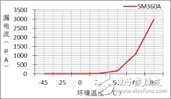 其实对二极管漏电流影响最大的还是环境温度,下图5是在额定反压下测试的关系曲线,从中可以看出:温度越高,漏电流越大。在75℃后成直线上升,该点的漏电流是导致二极管外壳在额定电流下达到125℃的两大因素之一,只有通过降额反向电压和正向导通电流才能降低二极管的工作温度。