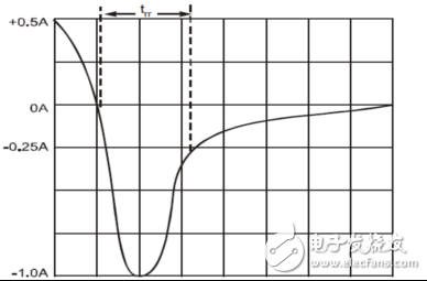 如图6所示,二极管的反向恢复时间为电流通过零点由正向转换成反向,再由反向转换到规定低值的时间间隔,实际上是释放二极管在正向导通期间向PN结的扩散电容中储存的电荷。反向恢复时间决定了二极管能在多高频率的连续脉冲下做开关使用,如果反向脉冲的持续时间比反向恢复时间短,则二极管在正向、反向均可导通就起不到开关的作用。PN结中储存的电荷量与反向电压共同决定了反向恢复时间,而在高频脉冲下不但会使其损耗加重,也会引起较大的电磁干扰。所以知道二极管的反向恢复时间正确选择二极管和合理设计电路是必要的,选择二极管时应尽量选择PN结电容小、反向恢复时间短的,但大多数厂家都不提供该参数数据。