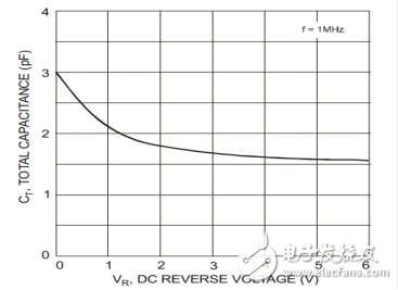 首先,我们熟悉下二极管的电容特性:图4所示的是IN4448HWS二极管的电容特性。零反向偏压下,电容是3pF,随着反向偏压越来越大,结电容越来越小。