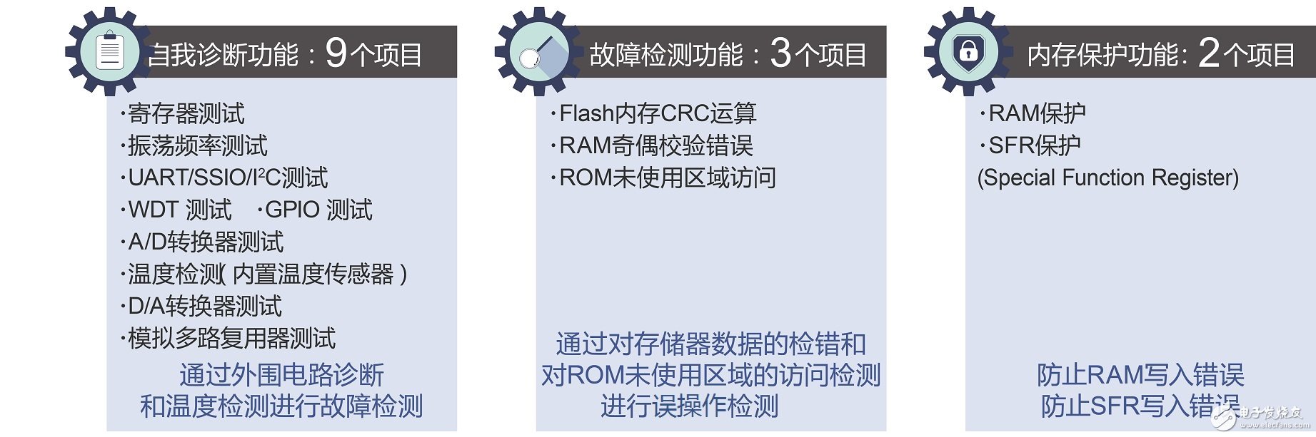 在各种产品中搭载的微控制器是控制着外围元器件的核心器件。通过微控制器的定期故障诊断,外围元器件的故障可在早期就被发现并规避风险。但是微控制器自身的故障必须由微控制器自己进行诊断来规避风险。