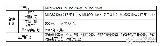 此次作为第一批样品的ML62Q1200系列、ML62Q1400系列、ML62Q1600系列共30个型号开始进行销售,这些样品相当于本系列中内存为16KB~64KB、封装引脚数为16pin~64pin的中小引脚封装。从2017年1月开始依次销售样品,预计于2017年7月起依次量产销售。前期工序的生产基地为蓝碧石半导体宫城株式会社(日本宫城县),后期工序的生产基地为ROHM Integrated Systems (Thailand) Co., Ltd. (泰国)。另外,第二批样品(66个型号)预计在2017年冬季开始销售。