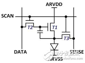 外部补偿像素电路比较简单,通常是3T1C结构如下图,除了传统的数据线以外,它有一个感应线(SENSE)可以将TFT和OLED的电流抽取到驱动IC中。