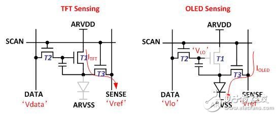 它有两种抽取电信号方式,一种是抽取TFT电流,被称作TFT sensing,一种是抽取OLED电流,被称作OLED sensing。基本原理都是给定TFT或OLED的驱动电压,把电流从感应线传抽取到驱动IC,如下图所示