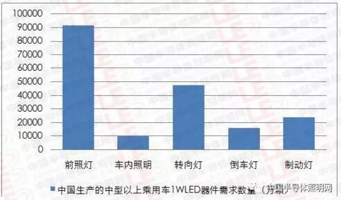 汽车照明主要包括汽车照明灯具(前照灯、雾灯、牌照灯、仪表灯、顶灯、工作灯等)和汽车信号灯具(转向灯、报警灯、示宽灯 、尾灯、制动灯、倒车灯 等)。据中国汽车工业协会统计,2016年1-10月,中国乘用车产量1884万辆,其中中型以上乘用车产量1064万辆,预计全年中型以上乘用车产量1318万辆。据CSA Research测算,中型以上乘用车对LED器件总需求量约22亿颗(按1W/颗折算),形成的市场需求规模约450亿元。