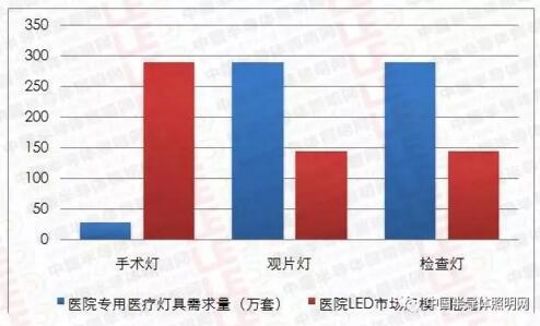 目前,LED在医疗方面的应用主要分为医院光环境照明和医疗专用器械设备两类。据中国卫计委统计,截至2016年10月底,全国医疗卫生机构数达99.0万个,其中医院2.9万个(公立医院12786个,民营医院15798个),同比增长6%。CSA Research测算,则2016年我国医院医疗专用设备应用(仅计算手术灯、观片灯及检查灯)的灯具需求量约600万套,形成的市场需求规模约580亿元。