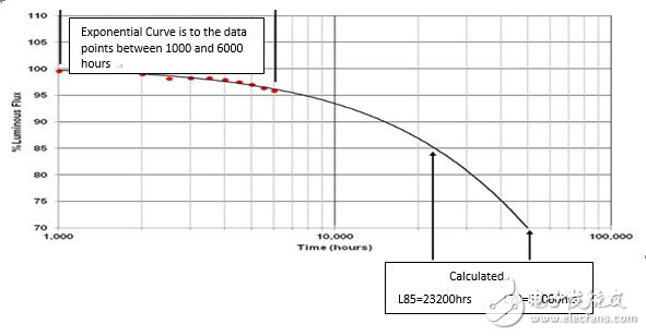 影响LED灯具寿命的关键因子,不外乎灯源与驱动电源中使用的电解电容,二者均与温度直接相关。现行市售灯具标示寿命,少则1.5万小时,多则5万小时,根据LED大厂的资料显示,一般高功率的LED平均寿命依LM-80或TM-21的测试结果推算,约为5万小时,图示为Cree对LED寿命测试与推算例。而LED驱动电源的寿命则取决于设计上选用之电解电容的等级与温度,通常不应低于LED的寿命,才是合理的设计选择。