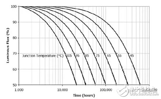 那么泡壳内的环境温度能够允许105度吗?只要看一下下面的一个图片就知道了。那是美国Cree公司有关LED芯片结温和光衰之间的关系。