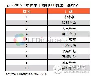 由于东南亚、印度等新兴市场LED照明需求快速增长,以木林森、鸿利光电为代表的中国本土照明封装厂商市占率逐步扩大,市场地位逐渐提升。