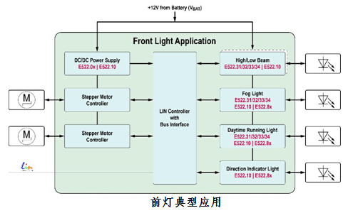 例如E522.80/81/82/83系列线性控制器可以作为电源集成电路型控制器控制如转向灯,尾灯等工作电流和功率比较小的LED灯,即,工作电流大约在大于40mA且小于70mA这个范围之内的LED灯。
