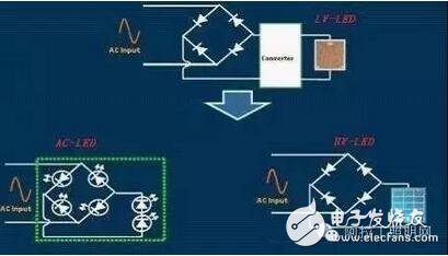 图1中LV-LED部分是目前使用最多的驱动方式,包括传统的整流桥部分,单颗粒LED,在中间需要一个电压转换电路。电压转换部分沿用了传统的开关电源技术,去电源化设计就是针对电源驱动,开发更合适LED应用电路,在批量的过程中简便可靠,采用传统的开关电源驱动LED以后会受到去电源化技术挑战。