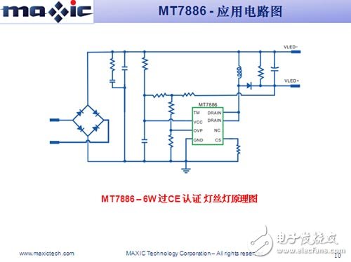 MT7886的目标应用包括:LED球泡灯、日光灯、信号灯、景观灯等;LED舞台灯、蜡烛灯、玉米灯等;其他LED驱动应用及通用恒流源。