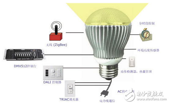 未来照明革新市场潜力巨大,如图1所示。分时段控制是指在不同时间段有不同的亮度。环境亮度传感器可以灵活应对灯具所处环境的亮度,比如天阴的时候天黑的比平常早,那么路灯就会提前打开。动作传感检测器是指夜晚的时候如果灯具周围无人活动时,会调低亮度,当检测到有人活动时,就会调高亮度。另外,现代照明需要有多重通信方式,除了无线方式以外,DALI或DMX512等先进的照明专用通信协议使得灯具的管理更加便捷,电力线载波通信(PLC)也是近年来备受关注的方向。