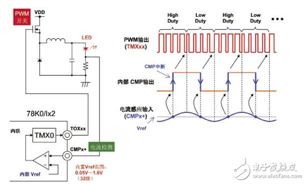 答:78K0的恒流控制主要通过定时器输出和比较器反馈来实现,通过比较器的LED反馈电流检测的反转时间点来控制定时器占空比来实现恒流。此芯片不内置光强度传感器,主要是通过恒流控制使LED达到稳定的发光。