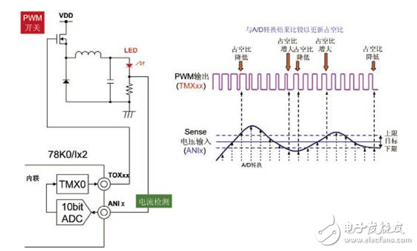 答:PWM 根据比较器的反馈进行占空比调节,因此不是恒定的。不同的LED的相同电压下的电流并不同,由于LED的发光是由正向电流大小决定的,所以需要用恒流控制而不是恒压控制来实现。然后,恒流控制除了比较器反馈之外还可以通过AD检测来实现,AD检测可以实施进行检测并调节电流,但是使用AD的话要需要更多的软件处理,但是纹波更小。