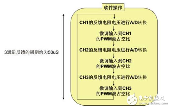 LED 恒流控制操作流程图如图4所示,如图,有3通道的LED需要控制,是A/D转换→PWM输出的微调的重复操作。软件操作过程是对CH1的反馈电阻电压进行 A/D转换,微调输入到CH1的PWM波占空比,然后对通道2和通道3进行同样操作,重复上述流程即可。三个通道的A/D转换和检测调整的整个周期约为 50μs。