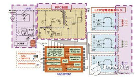 基于78K0/IB2 LED路灯方案如图8所示。可实现AC220V,具有 PFC;驱动总功率60W;调光通信接口可采用RS485/PLC接口。