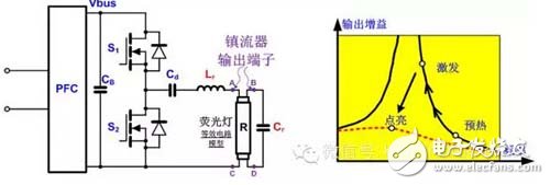 由上图可见,荧光灯可以等效为理想电阻,那么正常点亮荧光灯的过程其实就是改变LC谐振网络的输出增益的过程。同时也可以看到,由于电子式镇流器LC振荡电路采用开环式控制方式,所以其本身对所拖动荧光灯的型号(即荧光灯的等效阻抗)也是有所选择的。