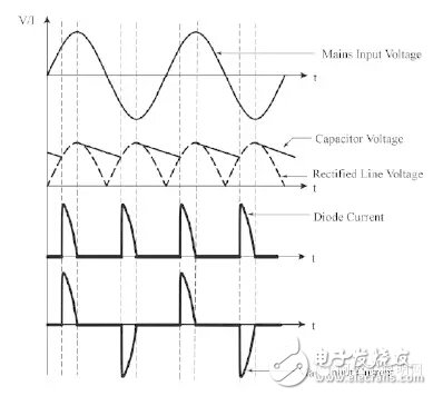LED本来就是需要有一定的启动电压(2V以上)才能导通,现在再要等输入电压升高到一定高度以后才导通,这样做势必会使得在两个半正弦波中间有一个很大的暗区(见图1箭头区),从而使得它的闪烁远比其他灯具(像白炽灯、荧光灯)要严重得多。