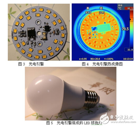 球泡灯采用线性驱动有个明显的好处是:无须使用电解电容器及磁性器件,整灯电子元件完全由贴片元件组成,可以实现自动化生产,提高可靠性的同时也提高了生产效率,降低了成本。图3是由此方案组成的光电引擎图片,整个系统全是贴片元件。非常简洁。图4是这个光电引擎发光时的热成像图,可见热量分布均匀。图5是由这个光电引擎组成的LED球泡灯。