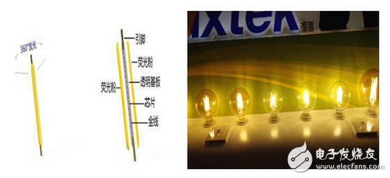灯丝灯是是球泡灯的另一种形态,其LED灯珠是类似火柴棒型的丝状。灯丝灯最早是在2008年,日本牛尾光源推出的由LED灯珠构成灯丝的仿传统白炽灯,引起业内极大关注,并且实现量产化。随后以LED灯丝为光源的蜡烛灯、球泡灯开始大量出现且被越来越多的消费者所接受,当时适用的场合主要是在五星级商务酒店、高档豪华住宅等室内照明场所,在人们的心理当中,它是一种高档的代名词。因为它兼备了2种精神,复古与创新,但未曾大量普及。随着技术的进步,LED灯丝的降价,灯丝灯慢慢平民化起来,开始飞入寻常百姓家。