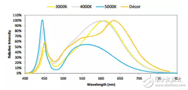 图 1: Bridgelux Vero 系列提供 70、80、90 和 97 Décor CRI 选择。 (暖白光光谱为 3,000 K 80 CRI,自然白光为 4,000 K 80 CRI,冷白光为 5,000 K 70 CRI。 承蒙 Intellident 提供数据)。